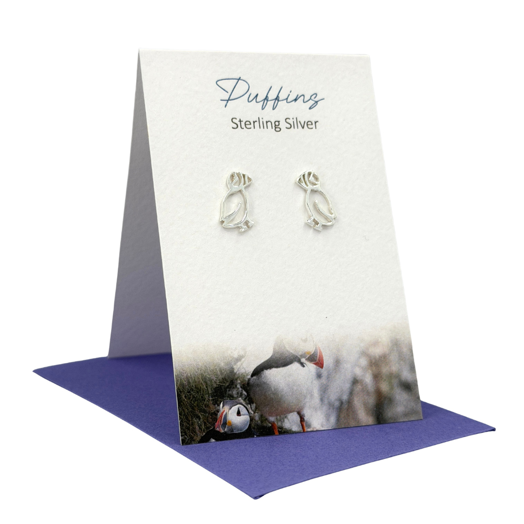 Puffin Sterling Silver stud earrings. Jewellery greeting card. Designed in Scotland by The Silver Studio.