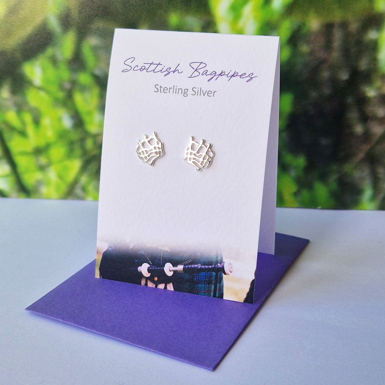 Scottish Bagpipe Sterling Silver stud earrings. A classic Scottish design. Jewellery greeting card. Designed in Scotland by The Silver Studio.